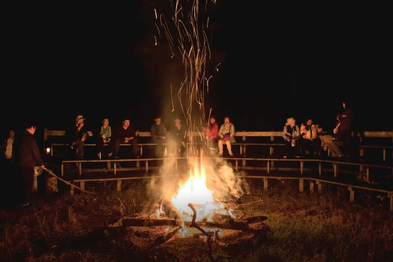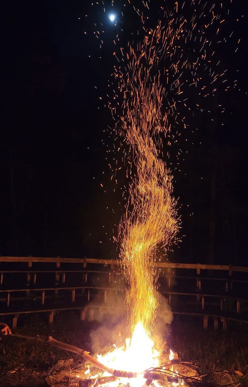 在营地的第一个夜晚,我们的成员、家人和朋友围坐在这片宁静而神秘的森林深处的篝火旁庆祝中秋节;在无云的天空下欣赏明亮的满月时,我们一边唱着《望月》、《月亮颂》……一边围着篝火跳舞。