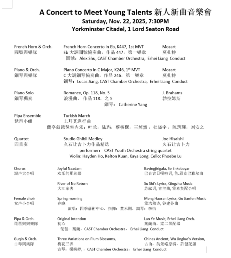 On November 22, 2025, the Four-Seasons Arts centre was invited to perform at “A Concert to Meet Young Talents” at Yorkminster Citadel by music director Dr. Liang Erhei from CAST Philomusica Orchestra.